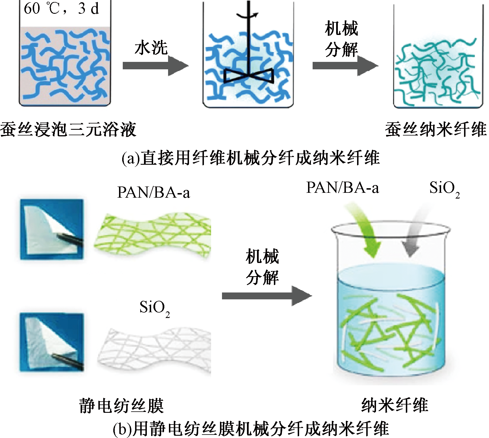 Mechanical fiber splitting method. (a) Direct mechanical splitting of fibers into nanofibers; (b) Mechanical splitting of nanofibres into nanofibres using electrospun membranes"