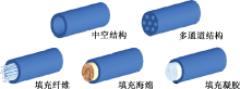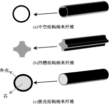 Nanofibers with different structures prepared by electrostatic spinning method. (a) Hollow structured nanofibers; (b) Groove-structured nanofibers; (c) Core-shell structured nanofibers"