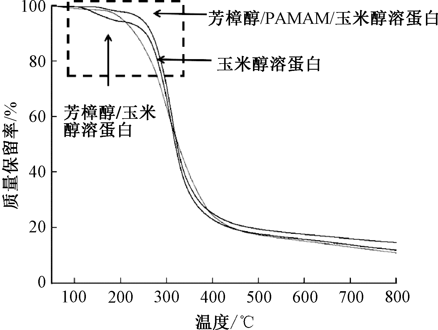 TGA curves of zein, linalool/zein and linalool/PAMAM/zein micro-nano nonwovens"