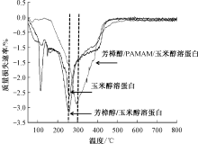 DTG curves of zein, linalool/zein and linalool/PAMAM/zein micro-nano nonwovens"