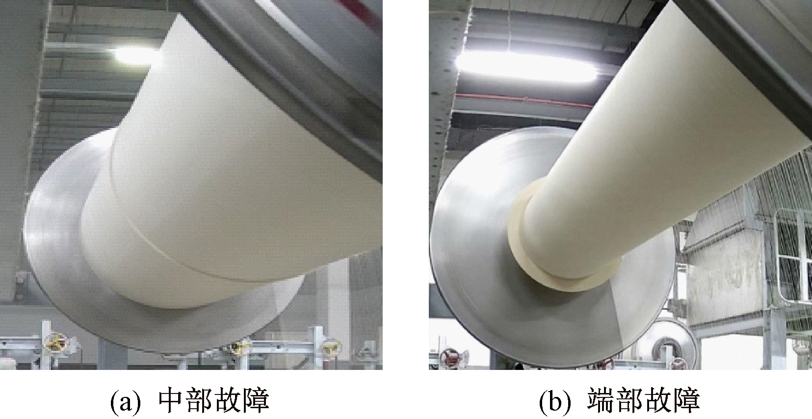 Characteristics of broken yarn faults in warp beam zone. (a) Center fault; (b) End fault"