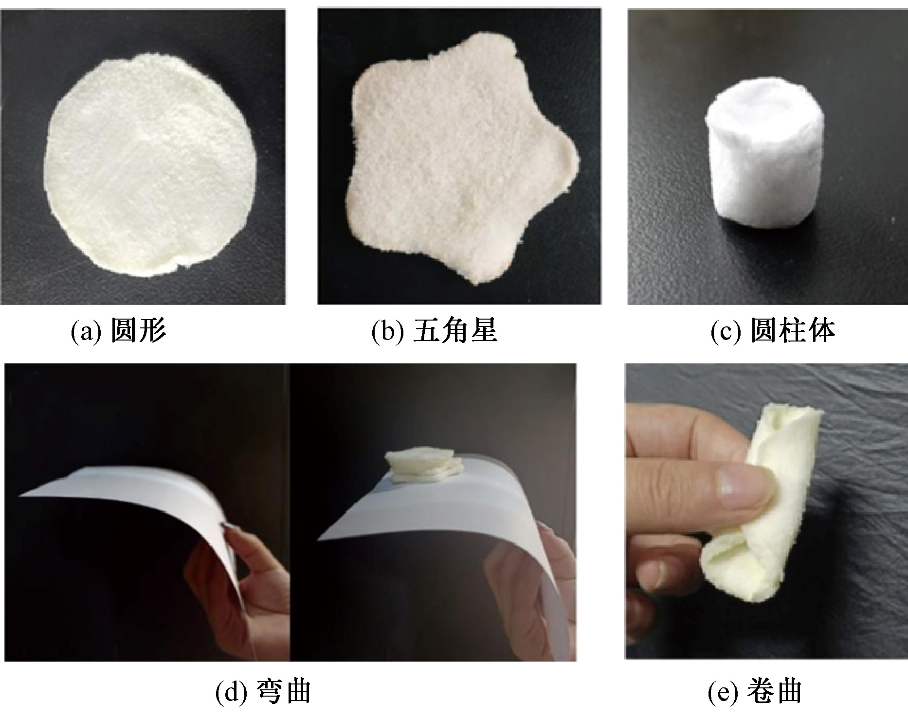 Presentation of flax cellulose aerogel samples. (a) Circle shaped; (b) Pentagram shaped; (c) Cylinder shaped; (d) Bend; (e) Curl"