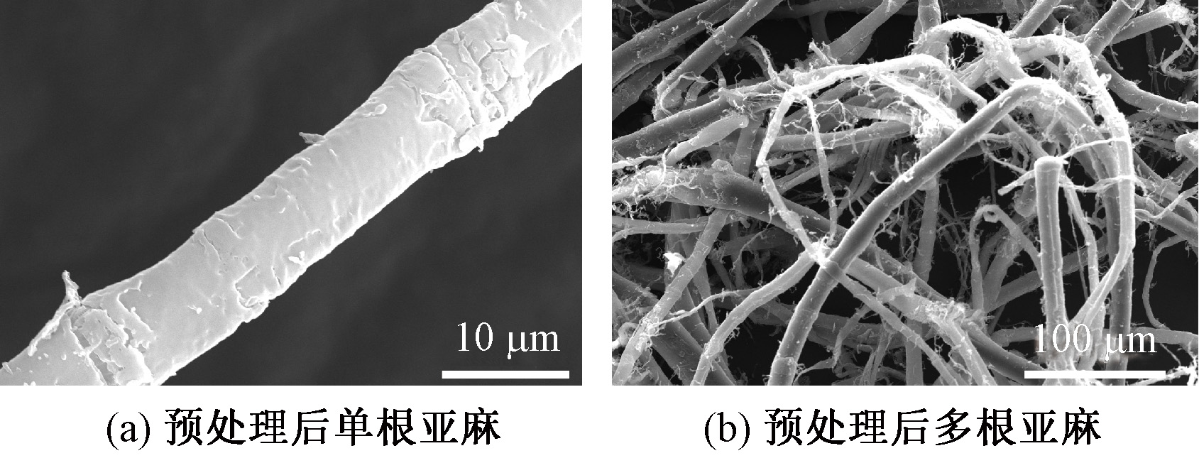 Morphology of waste flax fibers after pretreatment. (a) Single flax after pretreatment; (b) Multiple flax roots after pretreatment"