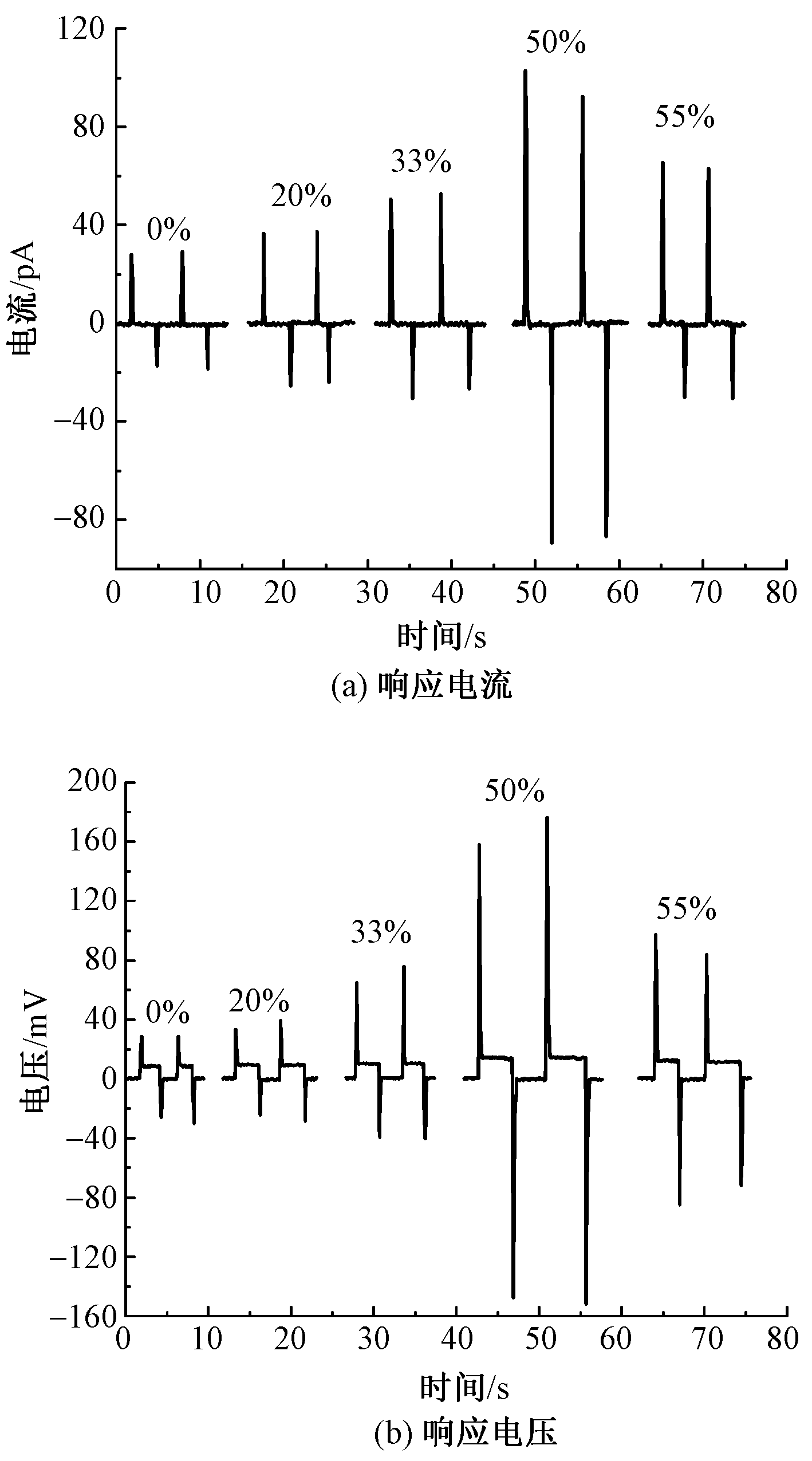 Flexoelectric response current (a) and voltage (b) of PAN/MoS2 fiber membrane with different mass fractions"