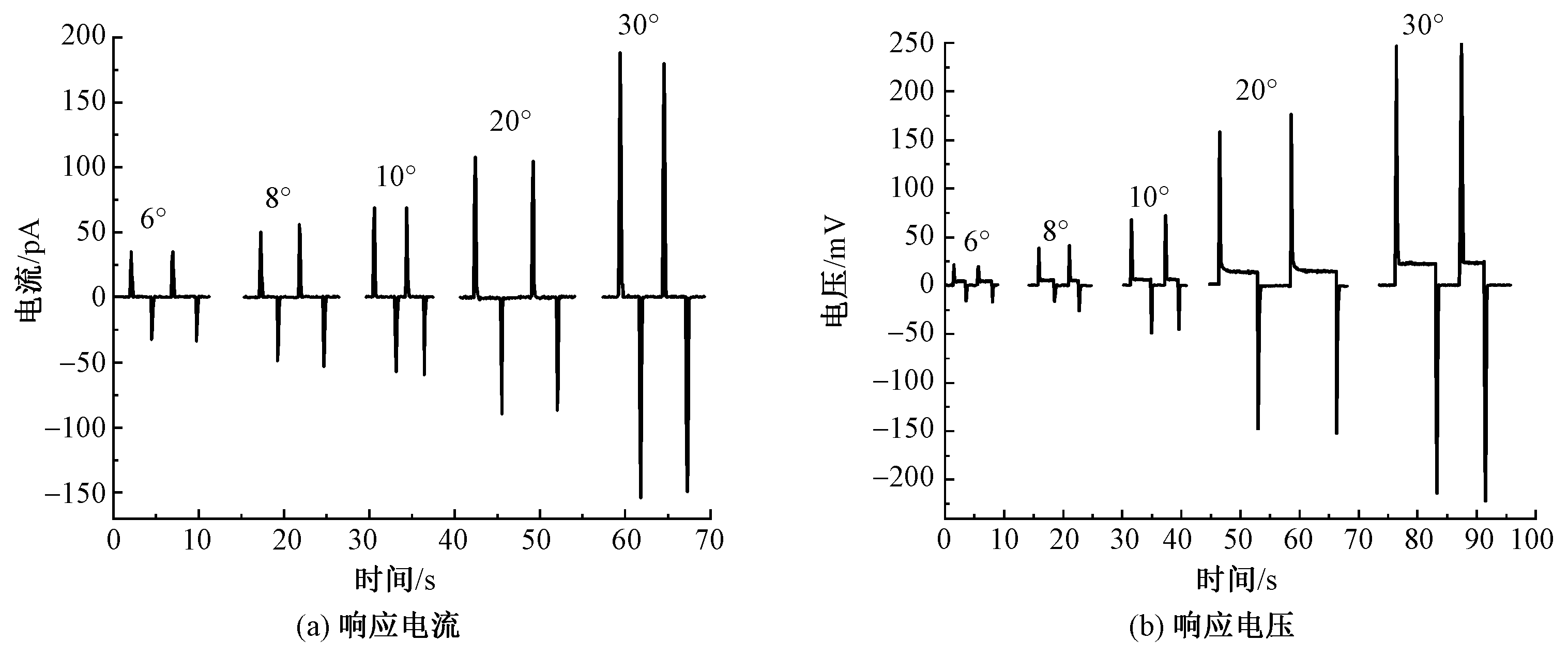 Flexeletric response current (a) and voltage (b) of PAN/MoS2 fiber membrane at different torsion angles"