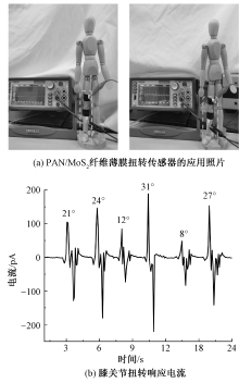 Practical application of PAN/MoS2 fiber membrane torsion sensor. (a) Application photograph of PAN/MoS2 fiber membrane torsion sensor; (b) Response current of knee joint torsion"