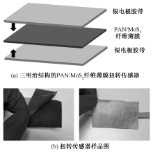 Structure and sample diagram of PAN/MoS2 fiber membrane torsion sensor. (a) Torsion sensor with sandwich-structured PAN/MoS2 fiber membrane; (b) Sample diagram of torsion sensor"
