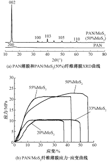 Crystal structure and mechanical properties of PAN/MoS2 fiber membrane. (a) XRD patterns of PAN and PAN/MoS2 (50%) fiber membrane; (b) Stress-strain curves of PAN/MoS2 fiber membranes"