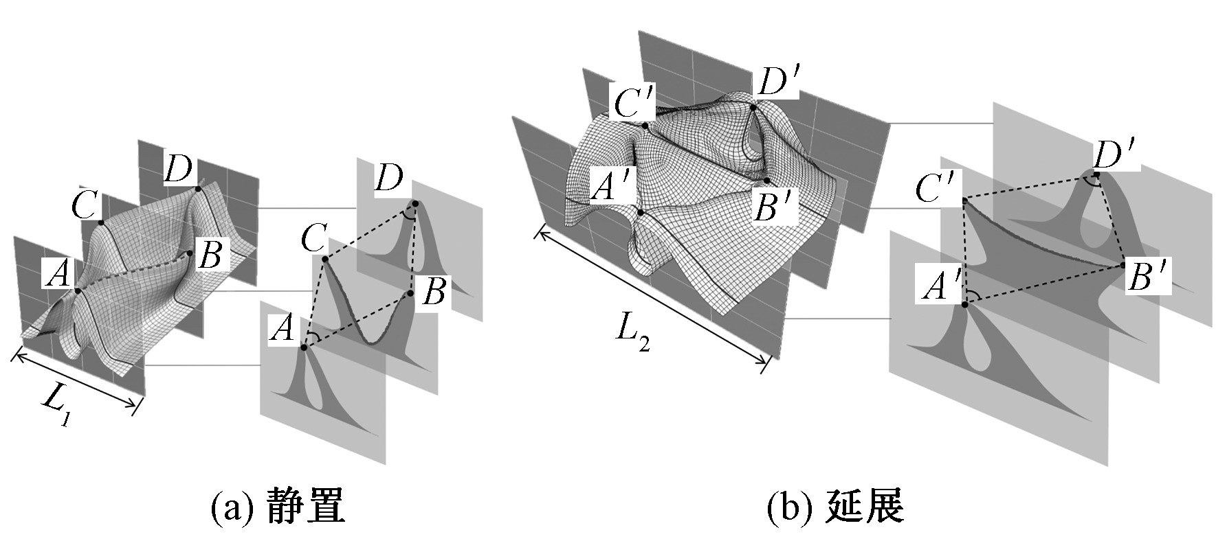 Comparison diagram of key structural details of diamond-shaped pleats under static and extended state. (a)Cross section under static;(b)Cross section under extended"