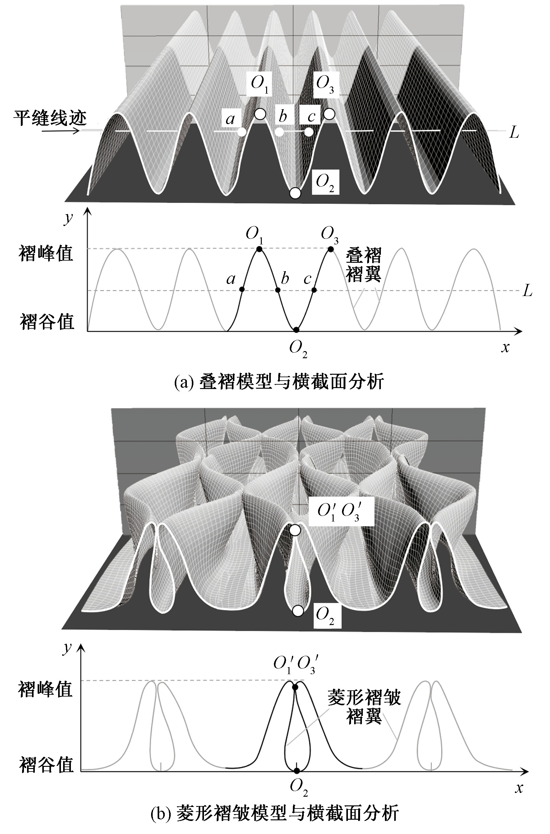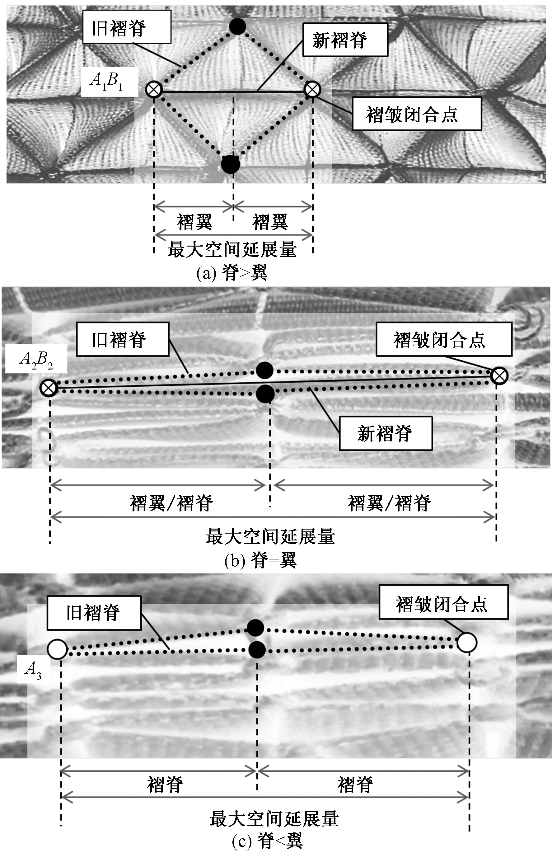 Analysis of diamond pleats under different "ridge-wing" relations. (a)Ridge > Wing ; (b)Ridge = Wing;(c) Ridge < Wing"