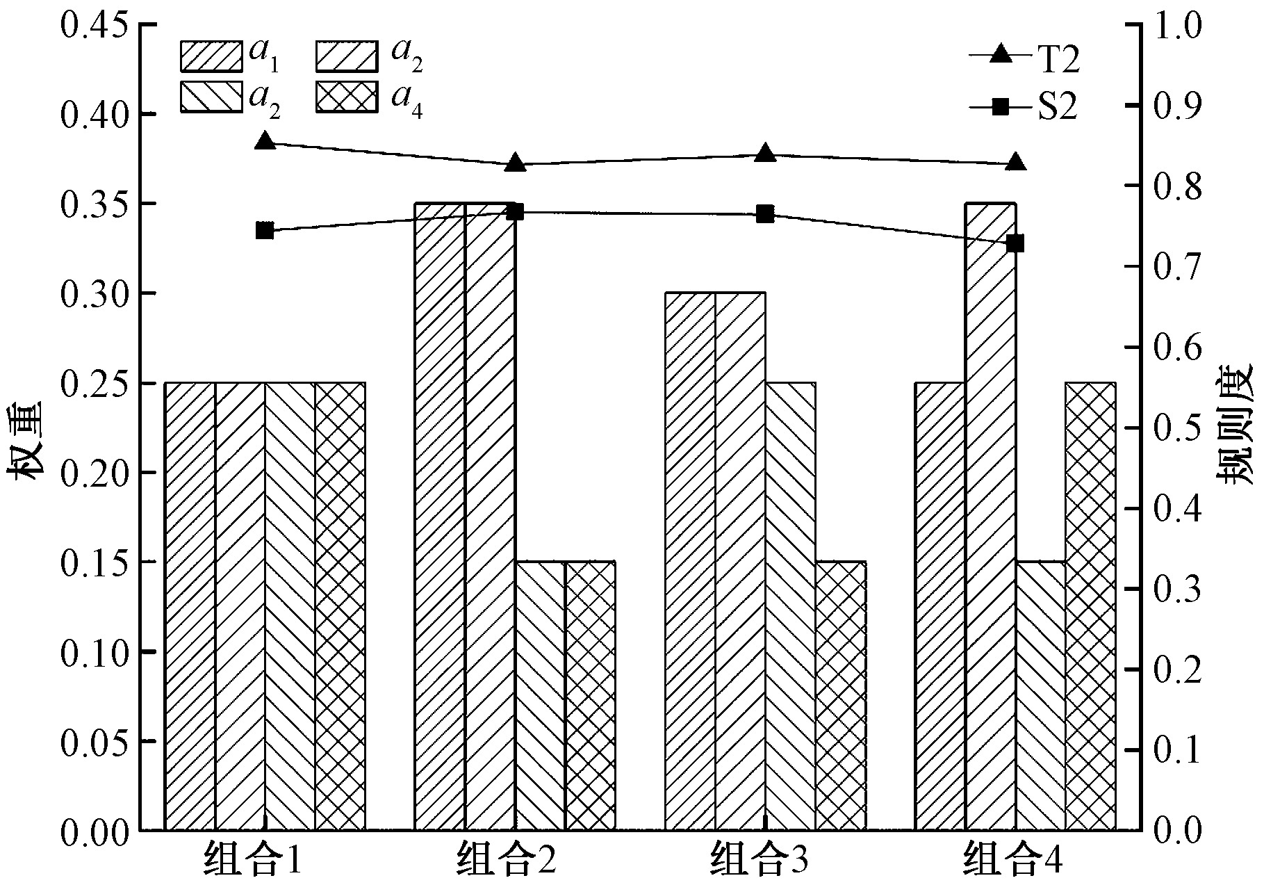 Changes in regularity of samples T2 and S2 with different combinations of weights"