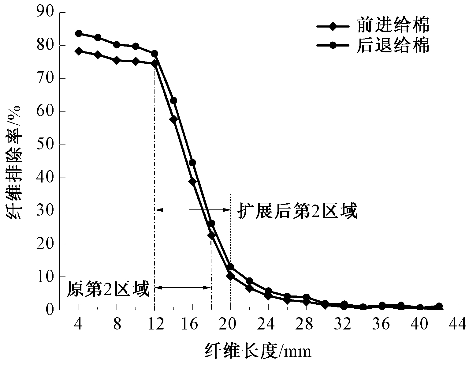 Results Through combing experiments of four different process schemes, the pattern of exclusion of different fiber lengths was obtained, and the following experimental results were obtained. The greater the number of effective carding times led to greater probability of the fiber being caught by the tin during the combing process. The number of effective carding times decreased with the increase of fiber length, that is, the longer the fiber is, the lower the probability of falling during the carding process. When the fiber length was greater than the fiber bundle length outside the mouth of the clamp plate, the probability of the fiber being caught by the tin in the carding process became less. Reducing the feed length, increasing the spacing of the noil and using the backward feed all increased the effective carding times of the noil, thus increasing the probability of the fiber falling during the carding process of the tin forest. During the combing process, the fiber exclusion rate decreased with the increase of fiber length, but the decrease of the fiber exclusion rate was different in different length sections, with a slow decrease in the 4-12 mm section and rapid decrease in the 12-18 mm range. The fiber length in the section above 18 mm slowly decreased to zero. Reducing the feed length significantly improved the exclusion rate of 4-12 mm fiber, but has little effect on the exclusion rate of fibers longer than 12 mm. The fiber exclusion rate of 4-20 mm section was significantly improved by increasing the spacing of noil or using backward feeding.