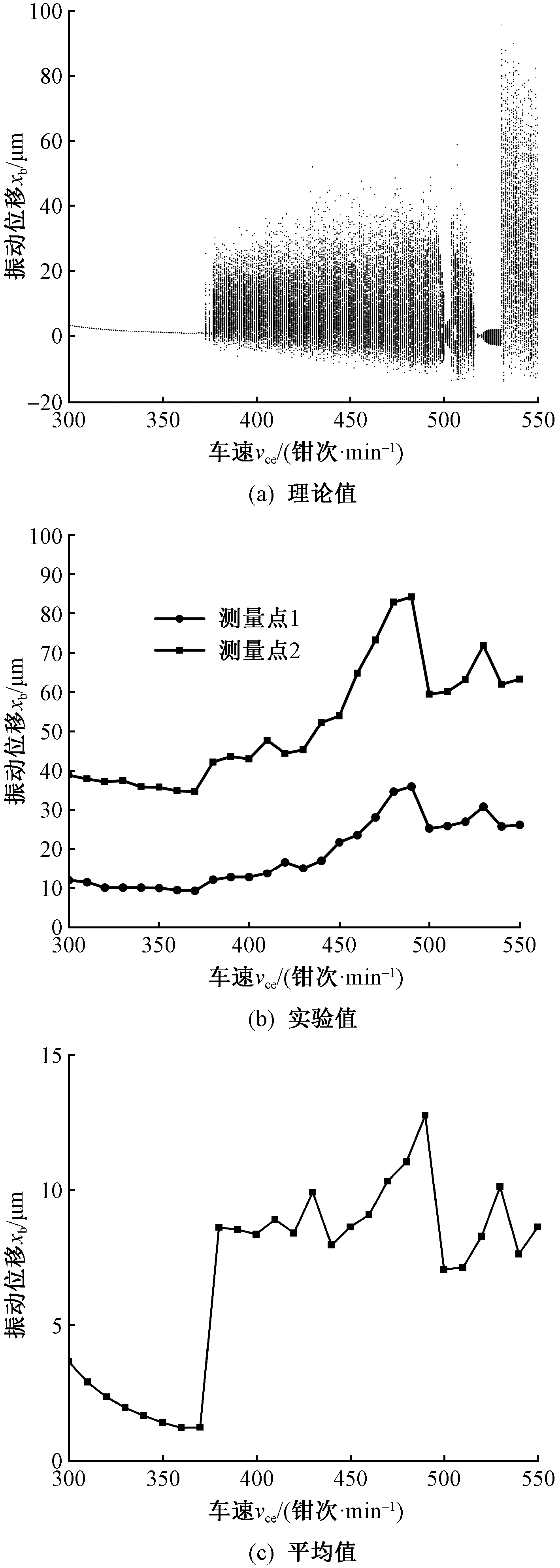 Vibration displacement at different vehicle speeds. (a) Theoretical value; (b) Experimental value;(c) Average value"