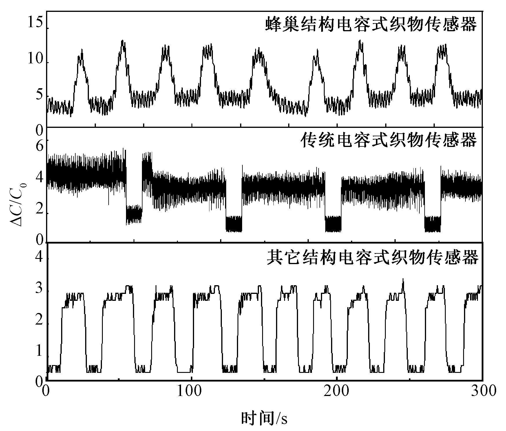 Results The fabric incorporates the use of texturized yarns for a fluffier and softer performance, giving the fabric excellent resilience, softness, breathability and moisture permeability, while enhancing the "compression-recovery" cyclic stability of the fabric capacitance sensor output signal. In terms of mechanical properties, the tensile stress of the 3-D honeycomb fabric gradually decreased with 10 cyclic tensile loading, which was attributed to the stress relaxation of the fabric when subjected to cyclic stress. On the washing test, the capacitance value of the fabric-based capacitive sensor showed overall decreasing after five washing cycles because the effects of detergent and water temperature. In addition, the fabric-based sensor maintained good air permeability (average air permeability being about 464.98 mm/s), and its excellent air permeability was attributed to the fact that the multilayer honeycomb structure of the fabric has fewer interweaving points, longer floating lengths, and larger gaps between the yarns that are favorable for air circulation. Meanwhile, this fabric-based capacitive sensor exhibits excellent bidirectional sensing performance, and maintains good durability and stability even after 2 000 cycles of stretching and compressing tests. After 2 000 "stretch-recovery" cycles, the maximum error was 6.53%. Under 2 000 cycles of "loading-unloading", the maximum difference in relative capacitance change rate was only 1.44%. A high sensitivity of 0.086 kPa-1 and a fast response time of <150 ms in the range of 0-10 kPa were achieved. The sensors were tested in three consecutive load/unload cycles at different loads (5, 10, 20 and 30 N) and showed good discrimination and stability at different load pressures.