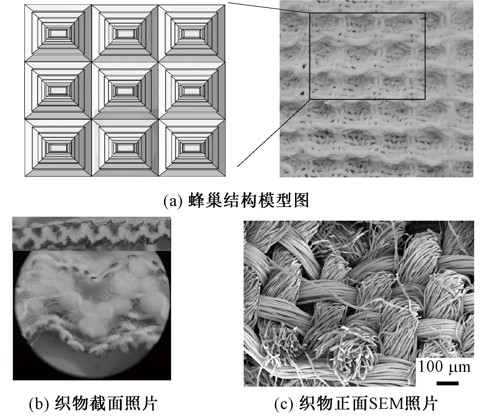 Surface topography of sensing fabric. (a) Model view of honeycomb structure; (b) Fabric cross-section; (c) Fabric front SEM image"