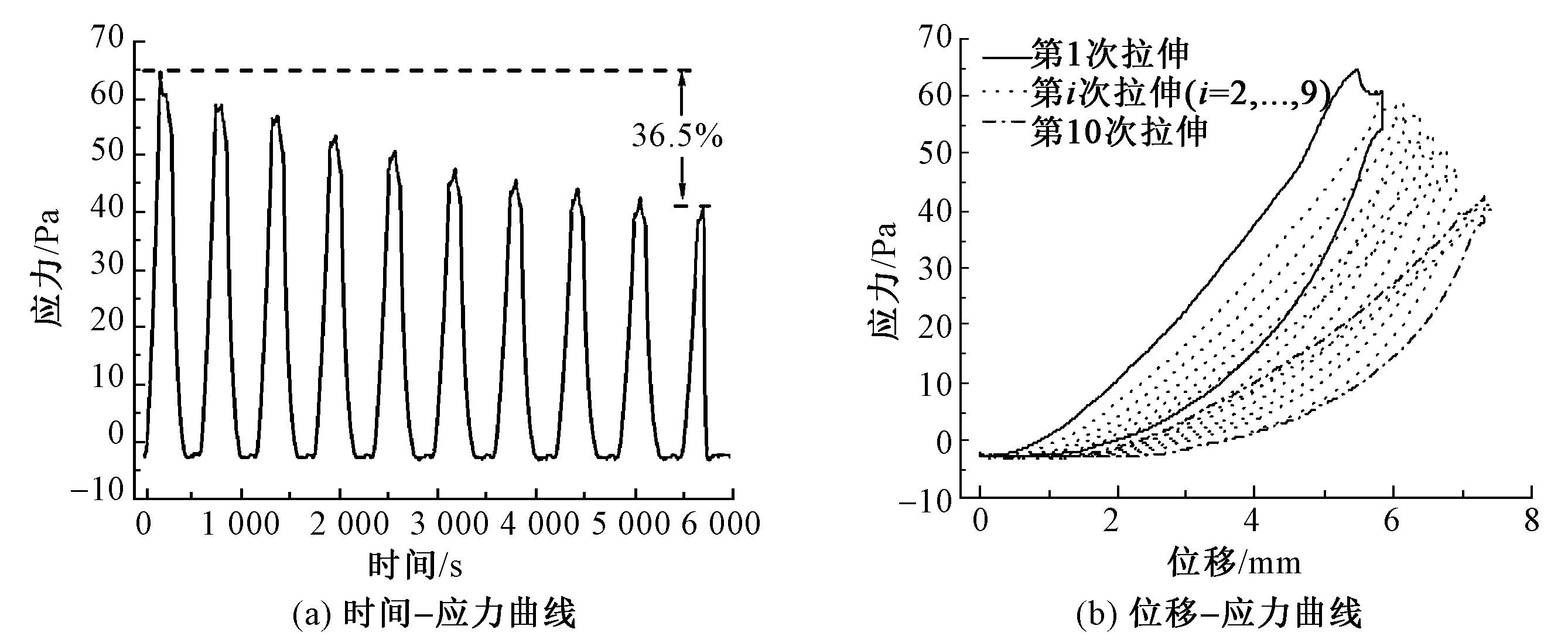 Mechanical performance of fabric-based capacitive sensors. (a) Time-stress curve; (b) Displacement-stress curve"