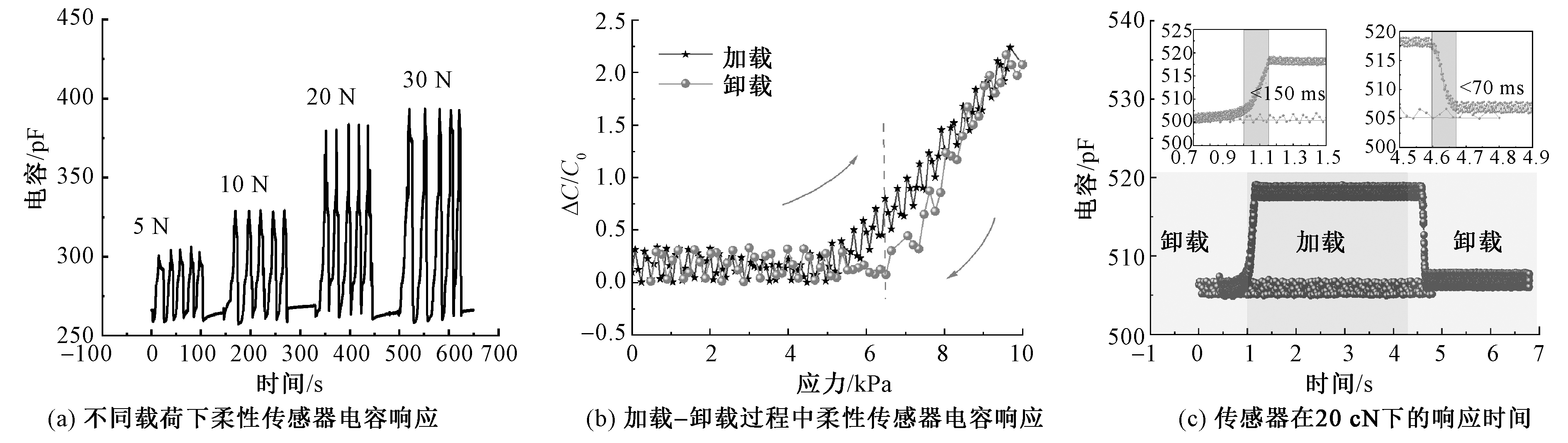 Sensing performance diagram for fabric-based capacitive sensors. (a) Plot of capacitive response of flexible sensor under different loads; (b) Capacitive response of flexible sensor during loading-unloading; (c) Response time of sensor at 20 cN weights"