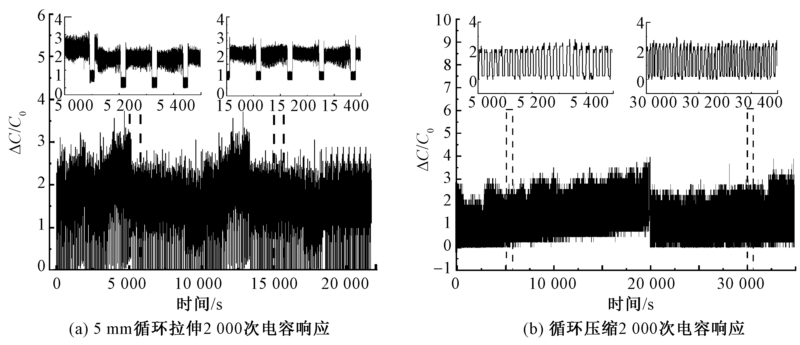 Capacitive stability of fabric-based capacitive sensors during cyclic loading. (a) Capacitance response under 5 mm cyclic tensile 2 000 times; (b) Capacitance response under cyclic compression 2 000 times"