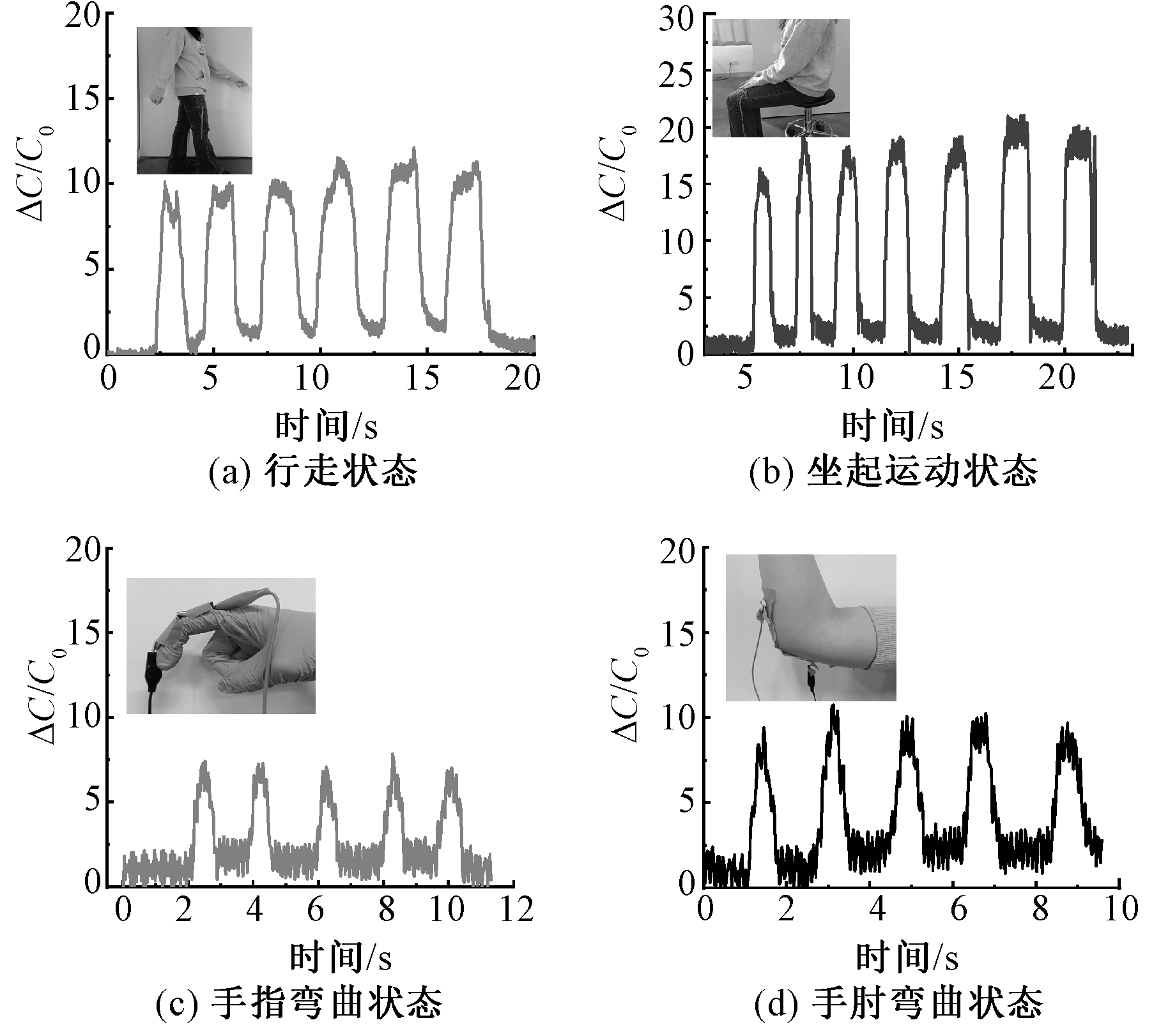 Capacitive response plots under various motion states. (a) Under walking; (b) Under sitting up motion; (c) Under finger bending motion; (d) Under elbow bending motion"