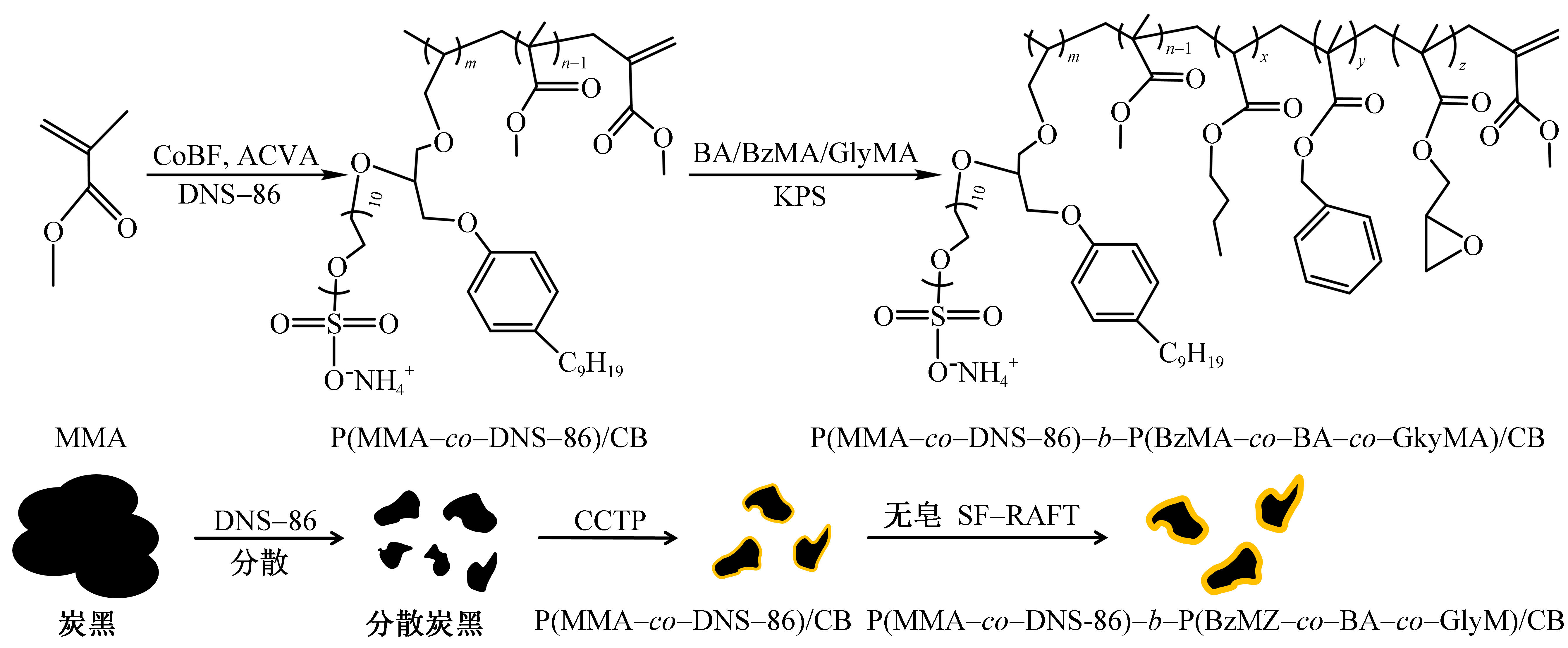 Objective Digital inkjet printing technology has the advantages of low energy consumption and less sewage discharge, which is a new way to solve the problems of high water consumption, high energy consumption, and high pollution in the printing and dyeing industry. Carbon black (CB) is the key pigment of printing inks, but CB is easy to agglomerates and cannot be dispersed in aqueous media. Improving the dispersion stability of CB in water is a difficult and hot topic in the field of digital inkjet printing. To solve the above problems, we synthesized reactive polymer encapsulated CB latex inks, to meet the demand for printing inks with environmental considerations.