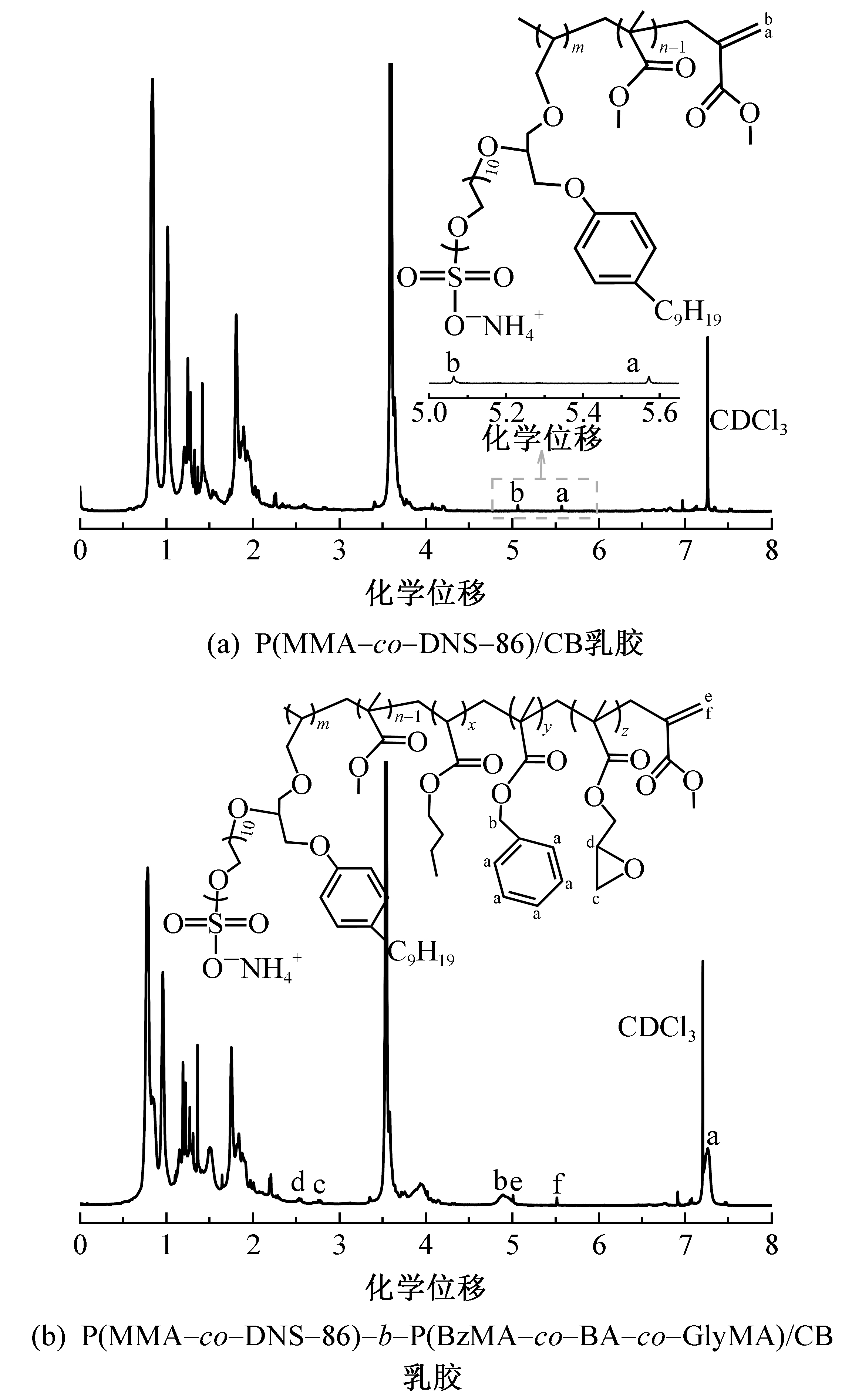 1H NMR spectra of reactive polymer encapsulated CB latex. (a) P(MMA-co-DNS-86)/CB latex; (b) P(MMA-co-DNS-86)-b-P(BzMA-co-BA-co-GlyMA)/CB latex"