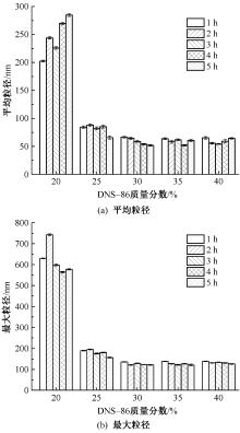 Influence of DNS-86 mass fraction and milling time on particle size of CB color paste. (a) Average particle size; (b) Maximum particle size"