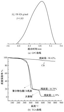 GPC(a) and TGA(b) curve of 5% GlyMA reactive polymer encapsulated CB latex"