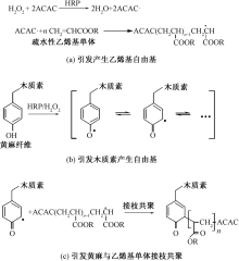 HRP-catalyzed graft copolymerization of hydrophobic vinyl monomers onto jute. (a) Generation of free radicals from vinyl monomers; (b) Generation of free radicals from lignin in jute; (c) Graft copolymerization of vinyl monomers onto jute"