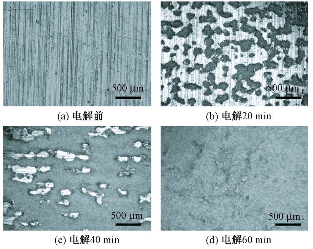 Surface morphology of anode changes with electrolysis time. (a) Before electrolysis;(b) Electrolysis for 20 min; (c) Electrolysis for 40 min;(d) Electrolysis for 60 min"