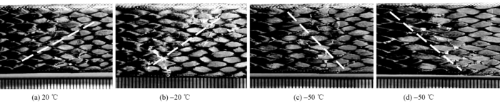 Bending failure morphology of 3-D braided composite T-beam with flange height of 10 mm at different low temperature"