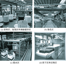 Actual layout of workshop. (a) Pre-spinning area, loading area and humidifying area; (b) Dyeing area; (c) Dewatering area; (d) Drying area and back spinning area"