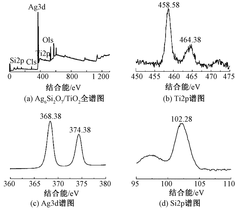 XPS spectra of Ag6Si2O7/TiO2. (a)Ag6Si2O7/TiO2 wide spectrum; (b)Ti2p spectrum; (c)Ag3d spectrum; (d)Si2p spectrum"