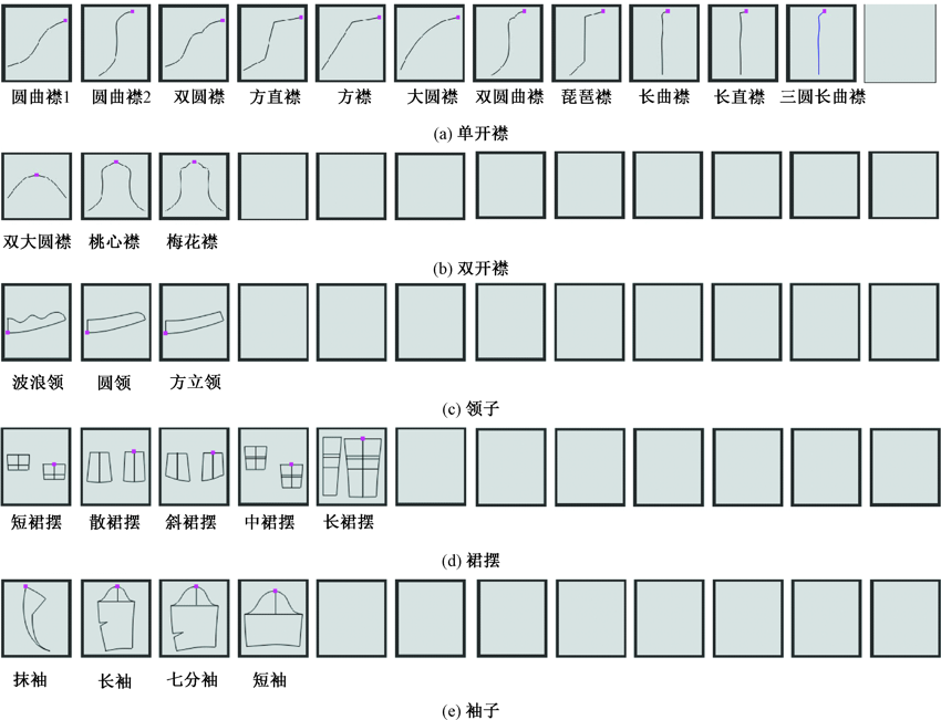 Modules of cheongsam patterns. (a) Single fly; (b) Double fly; (c) Collar; (d) Sweep; (e) Sleeve"