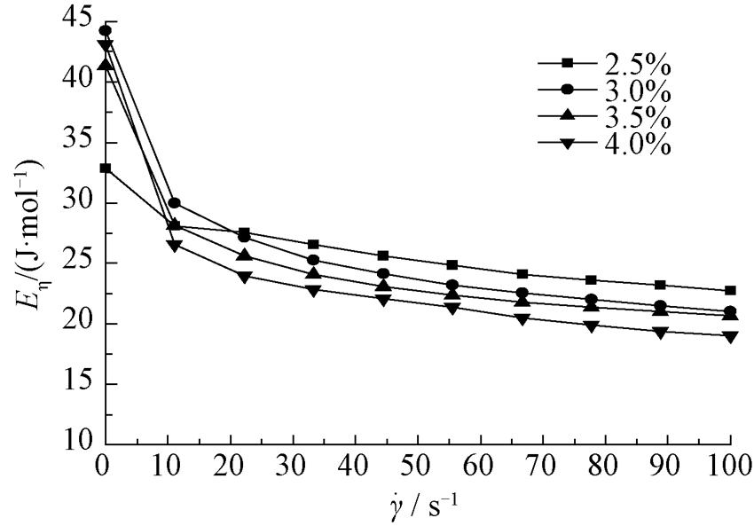 Viscous flow activation energy of cellulose/LiCl/DMAc solution at different shear rates"