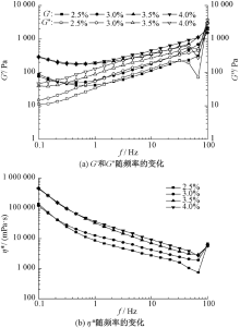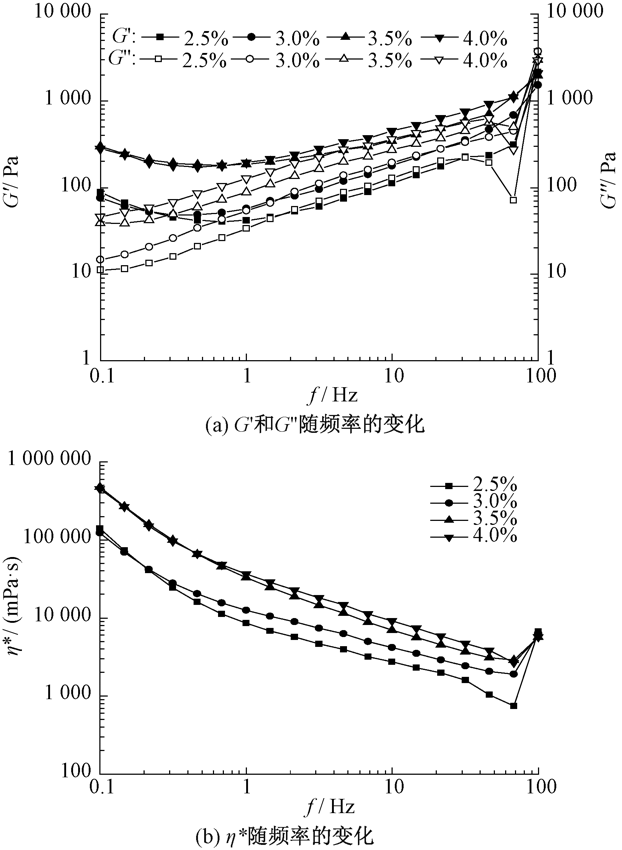 Dynamic rheological properties of cellulose/LiCl/DMAc solution with different mass fractions. (a) G' and G″ variation with frequency; (b) η* variation with frequency"