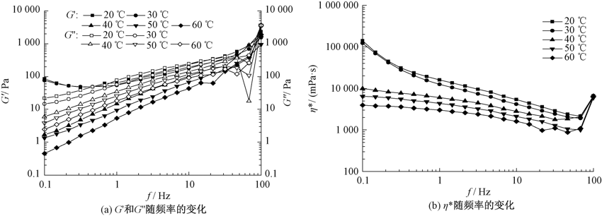 Dynamic rheological properties of cellulose/LiCl/DMAc solution at different temperatures. (a) G' and G″ variation with frequency; (b) η* variation with frequency"