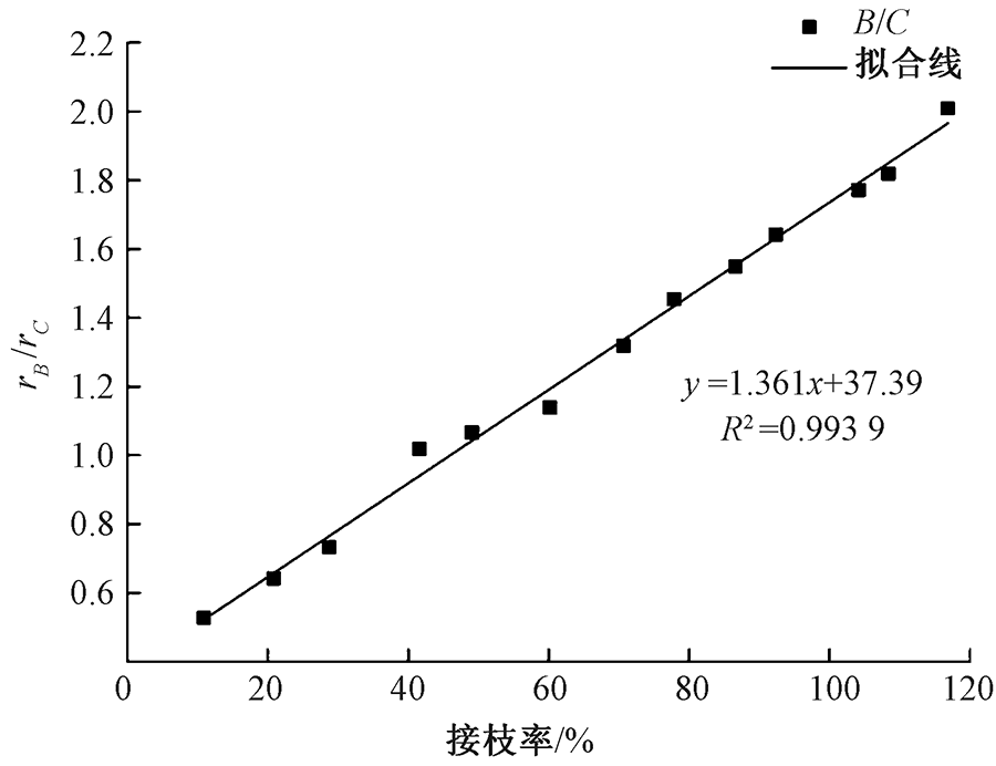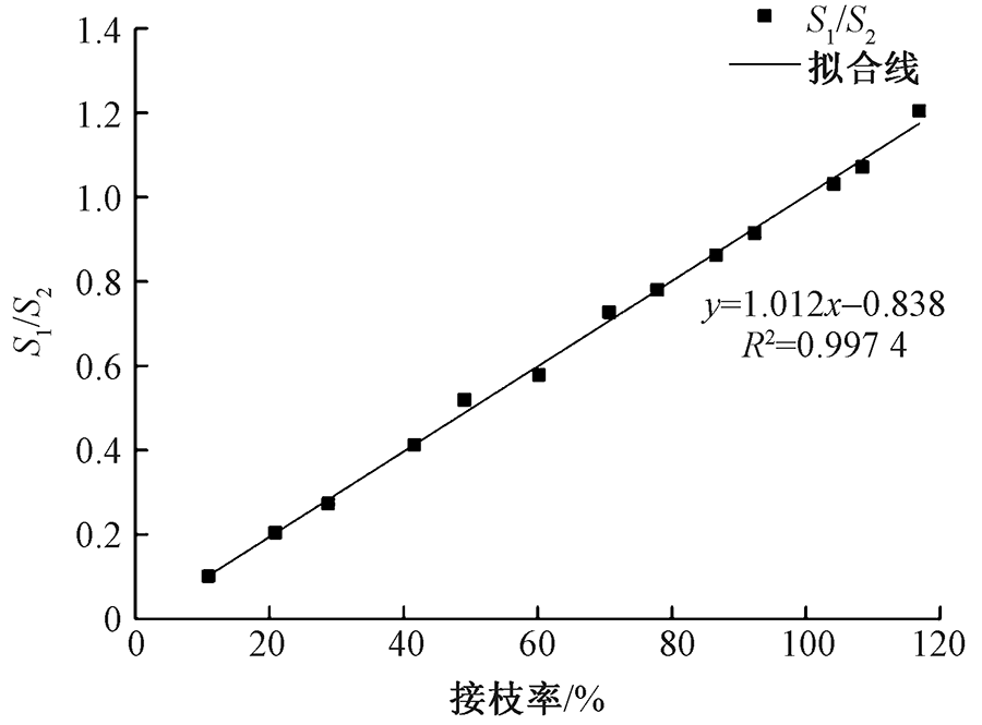 Linear fitting relationship between grafting rates of silk and ratios of characteristic weightlessness peak area"