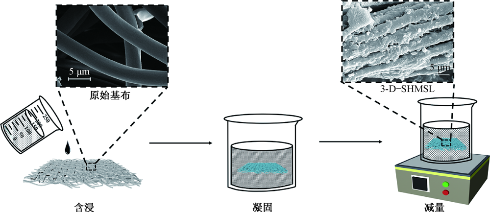 In order to tackle the poor durability of 2-D super hydrophobic microfiber suede leather, a construction method of 3-D super hydrophobic microfiber suede was proposed inspired by the hydrophobic structure of lotus leaf surface and the special 3-D network structure of microfiber nonwoven. The mixture of fluorine-containing waterborne polyurethane and nano precursor (tetraethoxysilane) was uniformly impregnated to superfine fiber nonwoven, and under weak acid conditions the nano precursor was induced to in-situ generate nano SiO2 particles inside the microfiber suede, which formed a lotus-like micro/nano rough surface with overall self-similarity. A 3-D super hydrophobic microfiber suede leather was bionically constructed, and its morphology, chemical composition, contact angle, friction durability and chemical stability were measured and characterized. The results show that the water contact angle of microfiber suede surface is up to 153.5°. After 2 100 times of abrasion, soaking for 24 h in aqueous solutions (pH=1 and 14) containing ethanol, p-xylene, tetrahydrofuran, and n-hexane, soap washing for 10 times, exposing to UV light for 24 h, and heat treatment, the water contact angle is still around 150°, demonstrating a durable 3-D super hydrophobicity.