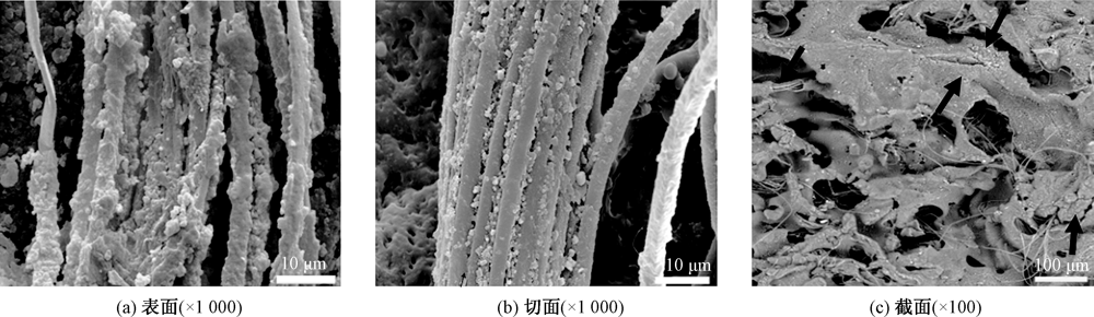 SEM images of different positions of 3-D-SHMSL. (a)Surface(×1 000);(b)Interface(×1 000);(c)Cross-section(×100)"