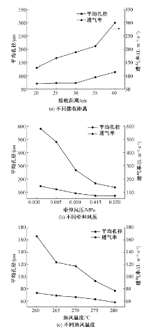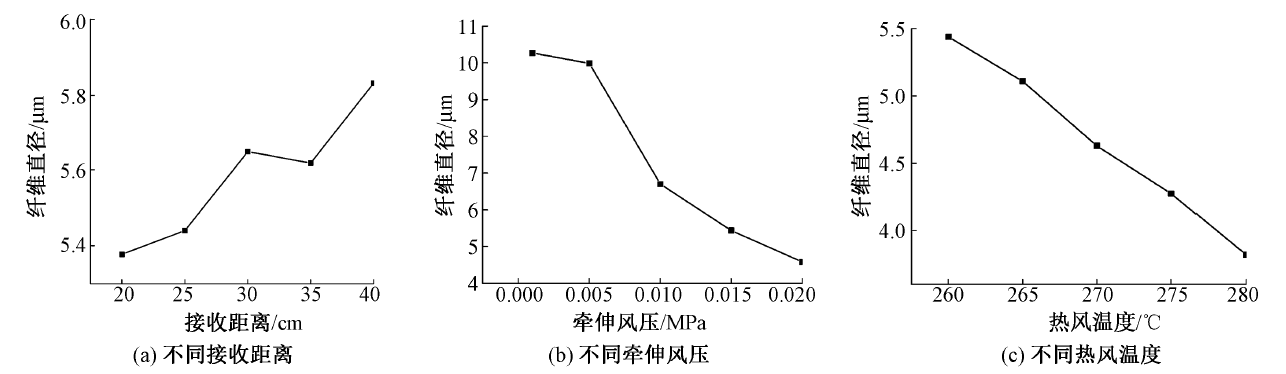 Variation trend of fiber diameter with different process parameters.(a) Different receiving distances; (b)Different drafting wind pressure; (c) Different hot air temperature"