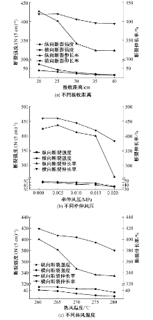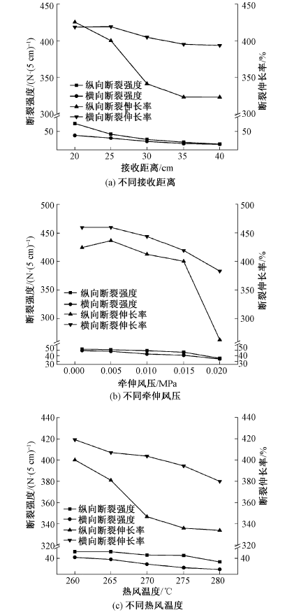 Mechanical properties of TPU meltblown nonwovens with different process parameters.(a)Different receiving distances; (b)Different drafting wind pressure;(c) Different hot air temperatures"