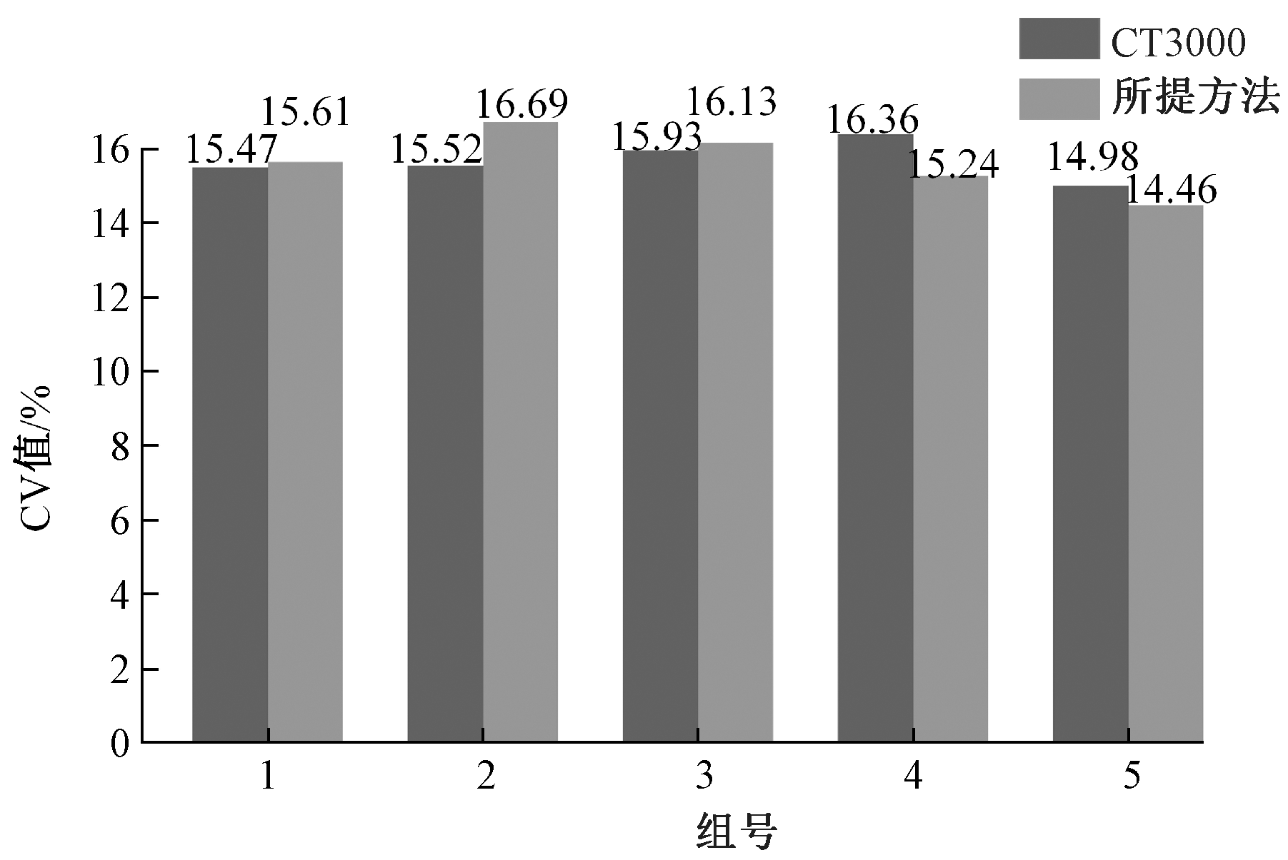 Results The camera was deployed to acquire 1 600 images of the yarn, whose resolution is 2 448 pixel×2 048 pixel, to calculate the optimal focal plane with the acquisition parameters. Compared with the images acquired under other focal plane parameters, the images acquired under the calculated focal plane parameters are of higher quality, which obviously improves the accuracy of contour extraction. 500 images of yarn were collected using the calibrated image acquisition system and processed with the proposed contour extraction method and other SOTA(state of the art) methods. The proposed method achieves OIS-F (optimal image scale), ODS-F (Optimal Dataset scale) of 0.91 and AP (average precision) of 0.89, which is more than 7% better than the current method. From the visual comparison results, it can be seen that the proposed method is based on the output of HED network, combined with morphological operations to remove the interference of hairiness and fiber texture, and reconstruct the yarn stem contour based on Cubic spline interpolation with good consistency. Finally, the extracted yarn contours were further processed using the proposed reconstruction method to calculate the CV value of yarn unevenness. In this paper, five groups of image data collected from different groups are processed using the proposed algorithm (experiments are performed using a Tesla V100 with 32 GB video memory GPU) to calculate the CV values for each group of 4 000 images. The average processing speed is about 24 frame/s, higher than the current experimental maximum image acquisition frequency of 20 frame/s. As shown in Fig. 6, the calculated results were compared with those of the laboratory high-precision electronic yarn evenness tester (CT3000), with an average error of less than 4% and a minimum accuracy of 92% and a maximum of 99% for a single group of tube yarn measurements.
