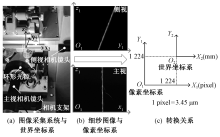 Online yarn image acquisition system and coordinate system transformation. (a) Image acquisition system and world coordinate system; (b) Yarn images and pixel coordinate system; (c) Conversion relationship diagram"