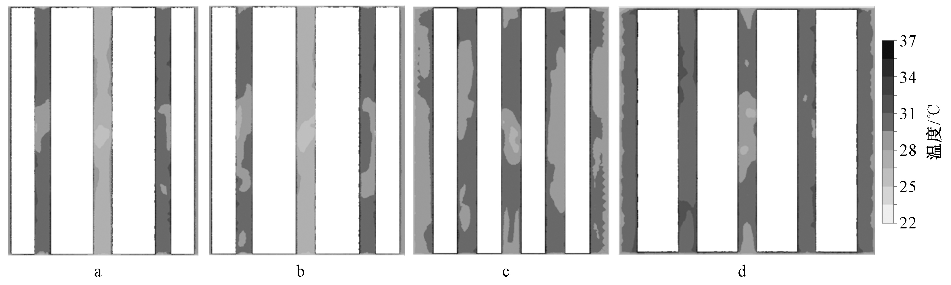 Results The simulated and experimental results of the temperature distribution for the directional uniform flow inlet showed high agreement with each other, which verified the effectiveness of the numerical model used. In terms of velocity distribution, (Fig. 3, 4), the directional uniform flow inlet had a more even airflow distribution due to the presence of the split blades, ensuring the airflow range meeting the requirements of the working area. The velocity showed a trend of being lower at both ends and higher in the middle, with a relatively gentle curve. The velocity was higher the winder area than in the spinner area in the model, demonstrating the capability of the new design for air volume distribution for a small environment. In contrast, the conventional mixed flow inlet did not have dispersed airflow, and the outflow direction was mostly on both ends. Due to the convergence phenomenon caused by the partial airflow passing through the air-supply structure, the velocity distribution was high at both ends and low in the middle, with considerable fluctuation in the spinner area. The velocity deviation coefficients for the two types of inlet were 0.209 3 and 0.088 9 respectively, indicating that the directional uniform flow inlet had a more even airflow velocity distribution. In terms of the temperature and humidity distribution in the calculation domain (Fig. 5, 6, 7), the mixed flow inlet exhibited local areas with obvious fluctuation in both temperatures and humidity due to unreasonable regulation of the air volume under different equipment heat dissipation situations. The directional uniform flow inlet had a uniform temperature and humidity distribution in each area due to the implementation of the split blades and the equal-flow guide plate. The new design was proven to meet the required environmental conditions of the winder area with low temperature and high humidity and the spinner area with high temperature and low humidity. The average temperature deviation coefficients for the two types of inlet were 0.015 2 and 0.008 3 respectively. Therefore, the directional uniform flow inlet had a more uniform temperature distribution.