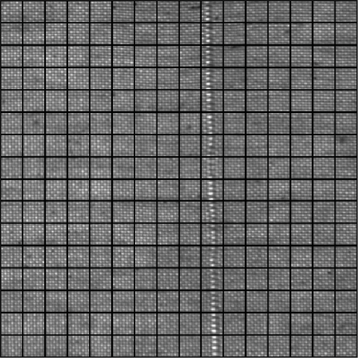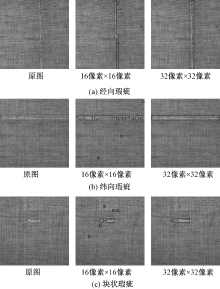 Detection results of different types of defects and different patch sizes. (a)Detection result of warp defect; (b)Detection result of weft defect; (c)Detection result of blocky defect"