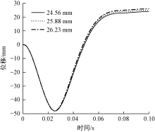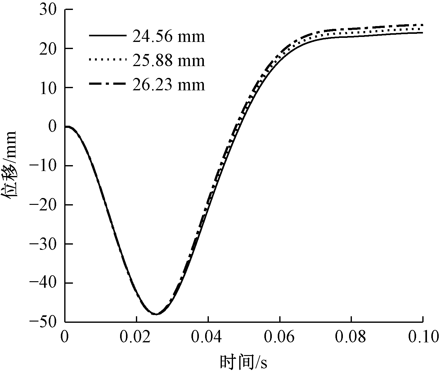 Displacements of detaching roller obtained from theoretical calculation and simulation and experiment"