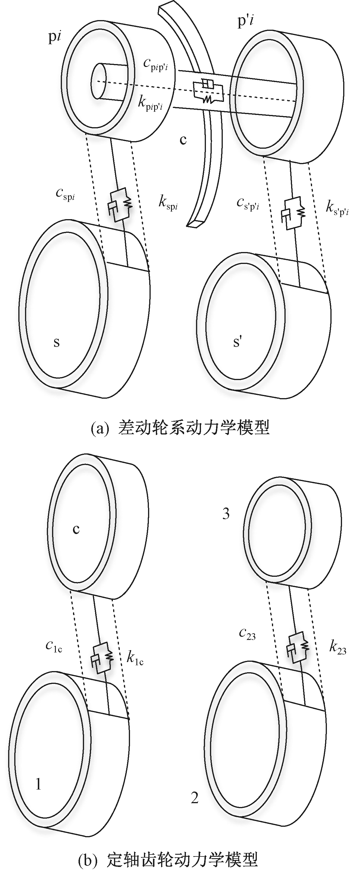 Dynamic model of gear transmission system of detaching roller. (a) Dynamic model of differential gear train; (b) Dynamic model of fixed axle gears"