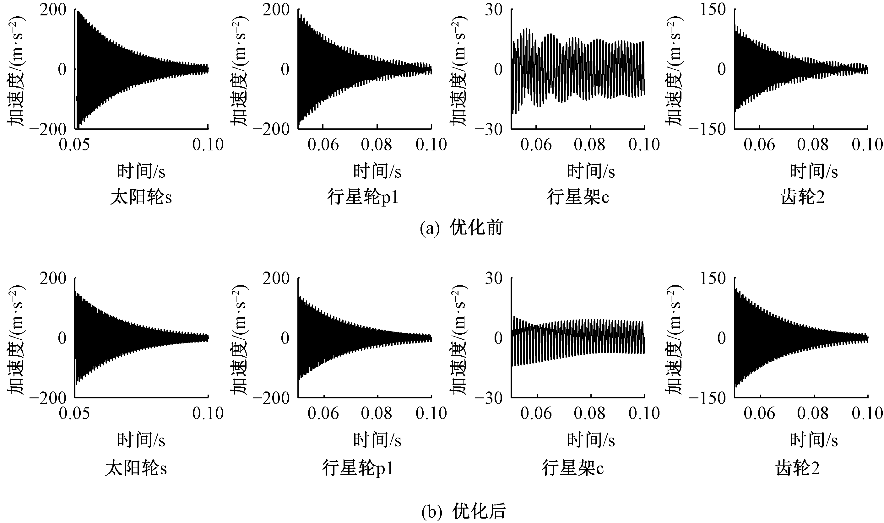 Comparison of vibration accelerations of some gears in transmission system before (a) and after (b) optimization"