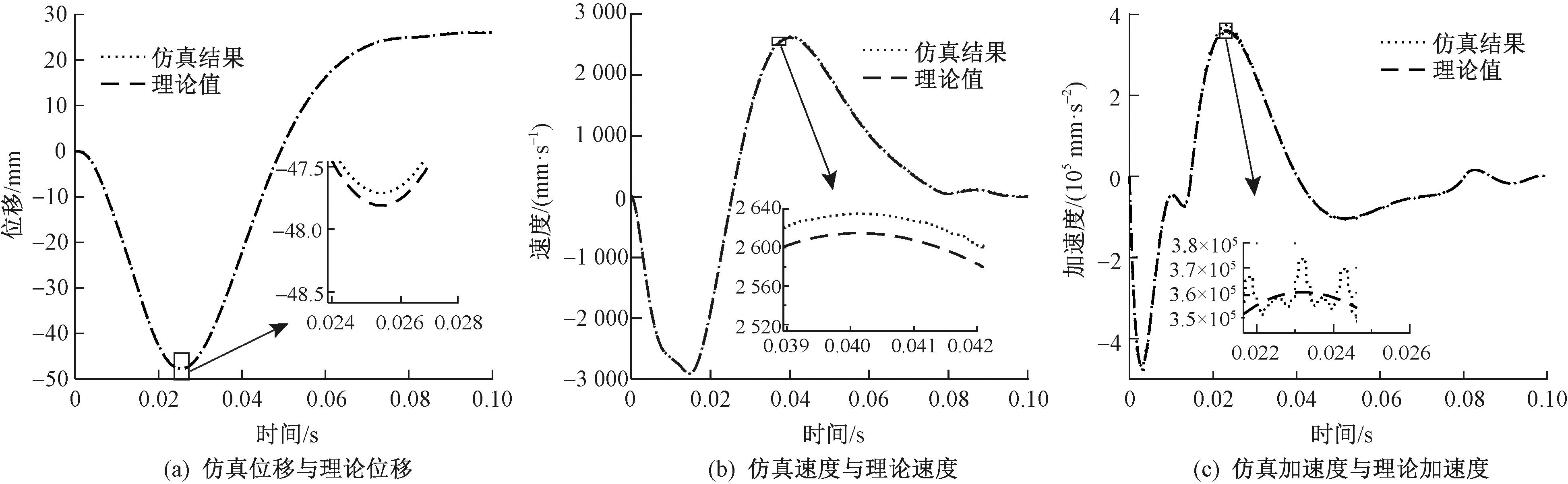 Comparison of motion curves of detaching roller obtained by simulation and theoretical calculation. (a) Simulated and theoretical displacements; (b) Simulated and theoretical speeds; (c) Simulated and theoretical accelerations"
