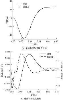 Movement law of detaching roller. (a) Curve of displacement and key points; (b) Curves of velocity and acceleration"